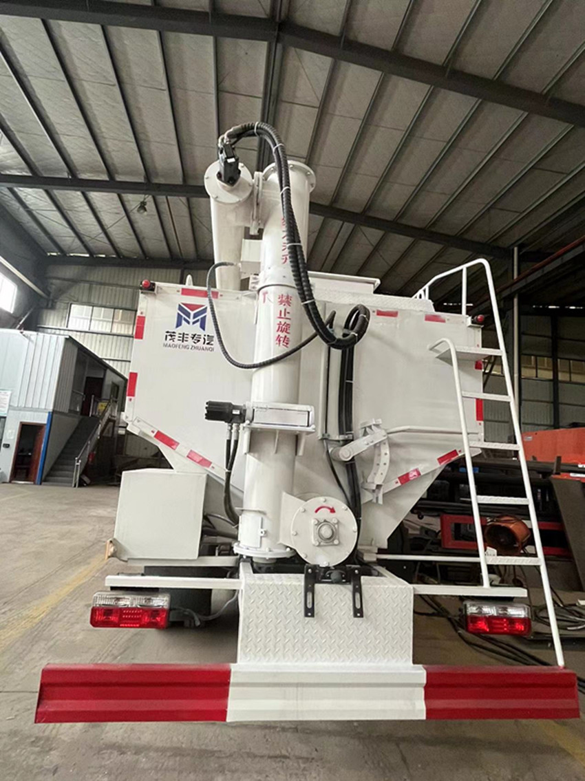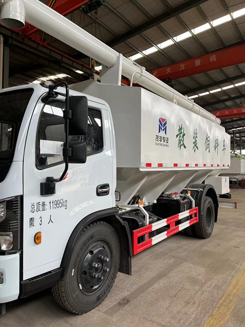 散裝飼料運輸車,散裝飼料車的飼料罐架設(shè)在卡車的底盤上,罐頂開有進料口.頂部的一根螺旋輸送卸料管(俗稱卸料絞龍)則可自由回轉(zhuǎn)和抬升,抬升的仰角可達60度。運輸時,頂部的螺旋管平臥在罐頂;卸料時則抬起,使管端的出料口與畜禽飼養(yǎng)場貯料罐頂部的進料門相接,駕駛室內(nèi)裝有操縱裝置(操縱裝置也可裝置在罐體尾部),卸料時通過車底的動力輸出軸和減速器來驅(qū)動螺旋,以完成卸料。