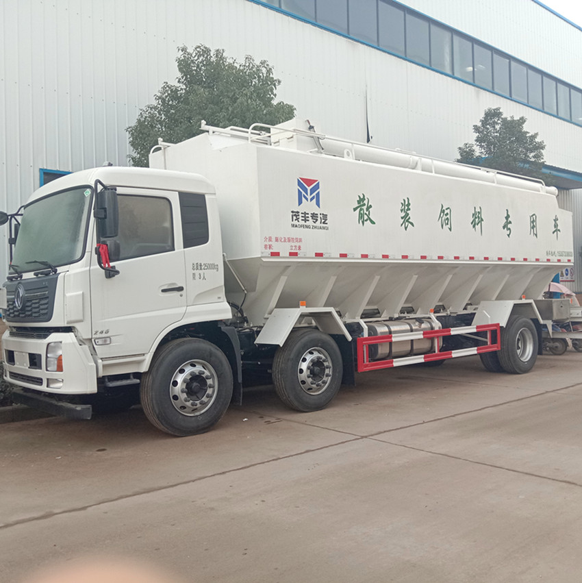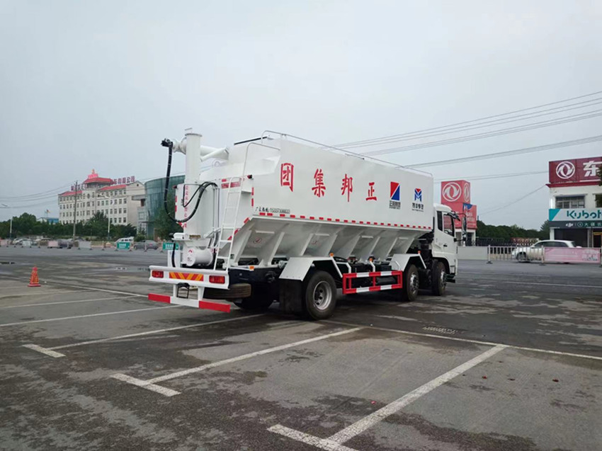 散裝飼料運(yùn)輸車,散裝飼料車的飼料罐架設(shè)在卡車的底盤上,罐頂開有進(jìn)料口.頂部的一根螺旋輸送卸料管(俗稱卸料絞龍)則可自由回轉(zhuǎn)和抬升,抬升的仰角可達(dá)60度。運(yùn)輸時,頂部的螺旋管平臥在罐頂;卸料時則抬起,使管端的出料口與畜禽飼養(yǎng)場貯料罐頂部的進(jìn)料門相接,駕駛室內(nèi)裝有操縱裝置(操縱裝置也可裝置在罐體尾部),卸料時通過車底的動力輸出軸和減速器來驅(qū)動螺旋,以完成卸料。