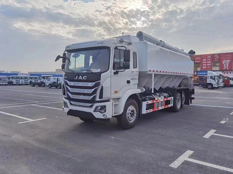 散裝飼料運輸車,散裝飼料車的飼料罐架設在卡車的底盤上,罐頂開有進料口.頂部的一根螺旋輸送卸料管(俗稱卸料絞龍)則可自由回轉和抬升,抬升的仰角可達60度。運輸時,頂部的螺旋管平臥在罐頂;卸料時則抬起,使管端的出料口與畜禽飼養(yǎng)場貯料罐頂部的進料門相接,駕駛室內(nèi)裝有操縱裝置(操縱裝置也可裝置在罐體尾部),卸料時通過車底的動力輸出軸和減速器來驅動螺旋,以完成卸料。